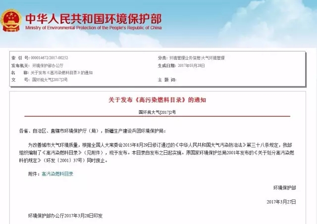環(huán)境保護(hù)部印發(fā)《高污染燃料目錄》(國(guó)環(huán)規(guī)大氣[2017]2號(hào))