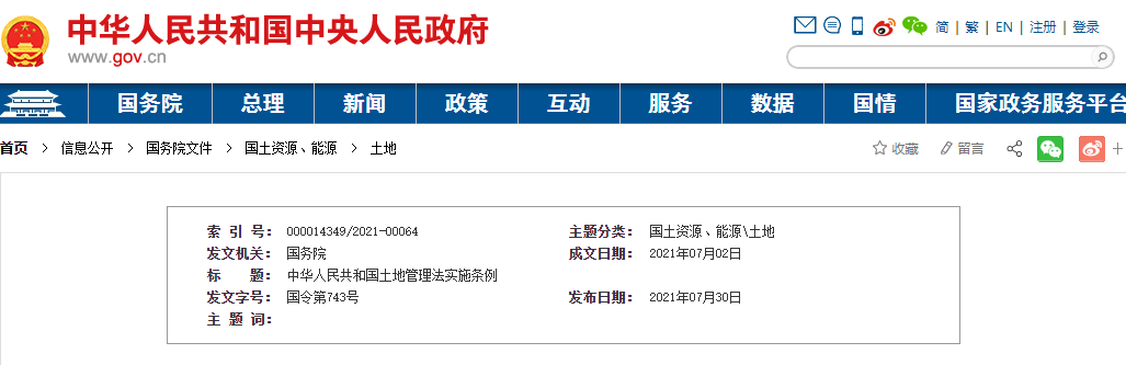 中華人民共和國(guó)國(guó)務(wù)院令第743號(hào)《中華人民共和國(guó)土地管理法實(shí)施條例》已經(jīng)2021年4月21日國(guó)務(wù)院第132次常務(wù)會(huì)議修訂通過(guò),現(xiàn)予公布,自2021年9月1日起施行。 總理 李克強(qiáng)2021年7月2日中華人民共和國(guó)土地管理法實(shí)施條例(1998年12月27日中華人民共和國(guó)國(guó)務(wù)院令第256號(hào)發(fā)布 根據(jù)201...