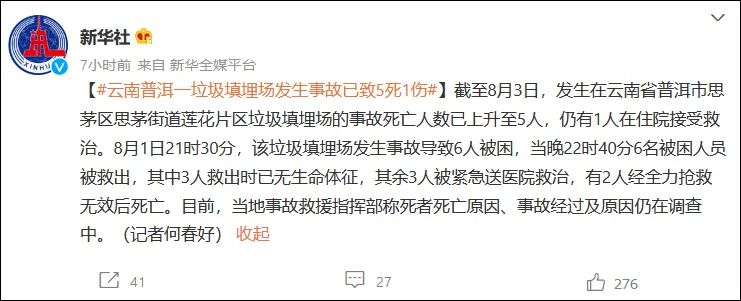 8月1日普洱市思茅區(qū)蓮花片區(qū)垃圾填埋場(chǎng)發(fā)生事故致6人被困目前事故死亡人數(shù)已上升至5人# 事件經(jīng)過(guò) #8月1日21時(shí)30分,普洱市思茅區(qū)相關(guān)部門(mén)接到報(bào)警,思茅街道蓮花片區(qū)垃圾填埋場(chǎng)有人被困。事故發(fā)生后,市委、市政府和思茅區(qū)委、區(qū)政府高度重視,市區(qū)兩級(jí)迅速成立“8.01”事故救援指揮部進(jìn)行現(xiàn)場(chǎng)緊急救援。...