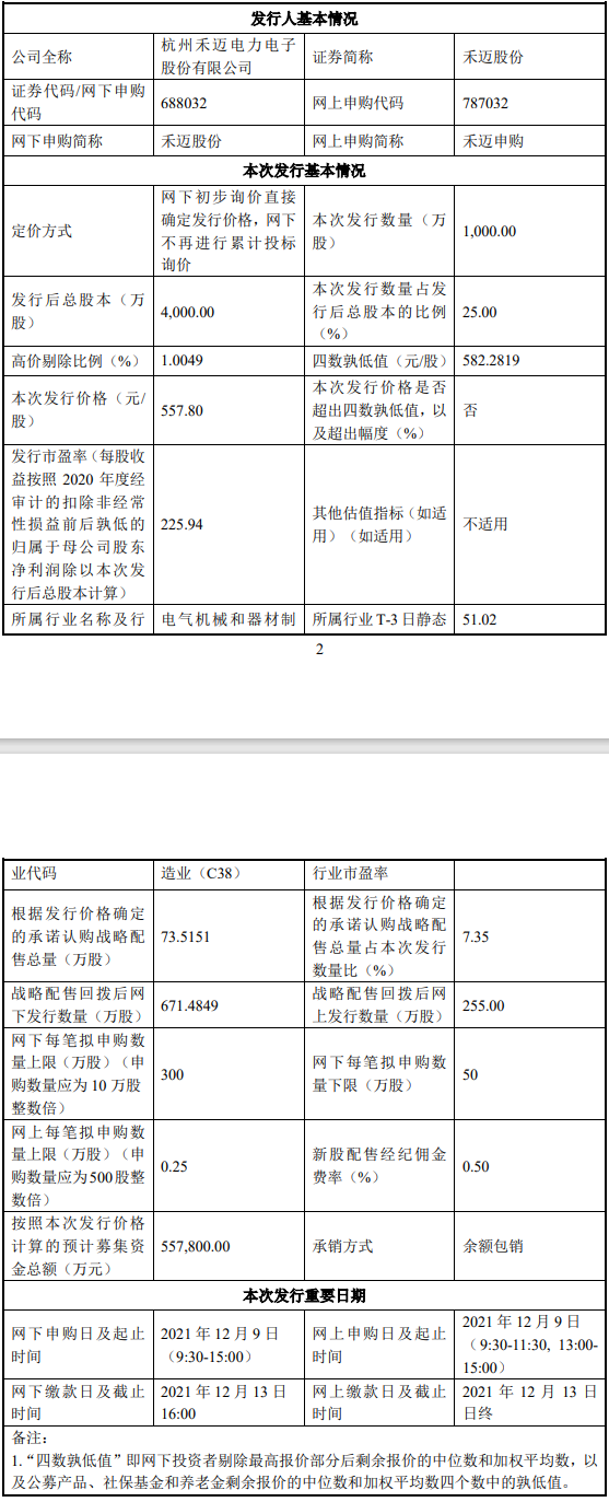 2021年12月9日,杭州禾邁電力電子股份有限公司正式申購。昨日,禾邁股份官宣發(fā)行價,業(yè)界沸騰! 557.80 元/股意味著什么? 意味著創(chuàng)下了A股歷史記錄,成為目前“最貴新股”,超過了8月義翹神州打新價(發(fā)行價為292.92元/股)。中一簽相當(dāng)于要繳28萬元左右,發(fā)行市盈率...
