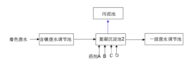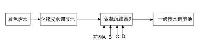 項目中含鎳廢水主要由著色工序產生,由于鎳是第一類污染物,必須車間排放口達標。項目擬對含鎳廢水單獨預處理,使總鎳車間排放口能達標,再將處理后的廢水匯入綜合調節(jié)池進行后續(xù)處理。含鎳離子廢水處理工藝原理如下: