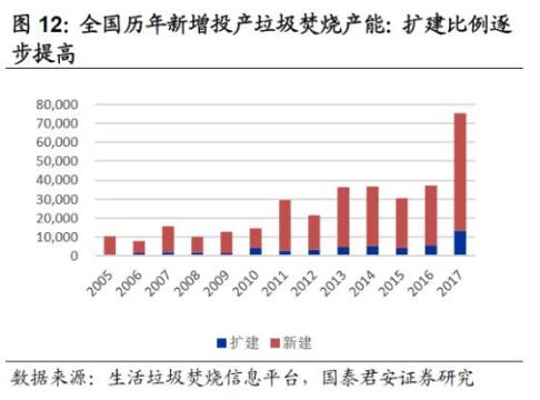 行業(yè)新增焚燒需求,主要來自城市化進(jìn)程以及原有城市環(huán)衛(wèi)服務(wù)開始覆蓋鄉(xiāng)鎮(zhèn)而收集面積增大。帶動(dòng)三四線城市新建項(xiàng)目以及原有項(xiàng)目的擴(kuò)建需求。從我們總結(jié)的數(shù)據(jù)來看: