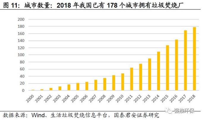 行業(yè)新增焚燒需求,主要來自城市化進(jìn)程以及原有城市環(huán)衛(wèi)服務(wù)開始覆蓋鄉(xiāng)鎮(zhèn)而收集面積增大。帶動(dòng)三四線城市新建項(xiàng)目以及原有項(xiàng)目的擴(kuò)建需求。1)新建項(xiàng)目向三四線城市拓展趨勢(shì)較明顯,我國(guó)有垃圾焚燒廠的城市個(gè)數(shù)由2011年的64個(gè)增加到2018年的178個(gè);2)52%的已投運(yùn)項(xiàng)目已經(jīng)或正在擴(kuò)建,在已投運(yùn)的362個(gè)項(xiàng)目中,其中175個(gè)為單體項(xiàng)目,187個(gè)已經(jīng)或正在二期及三期擴(kuò)建。