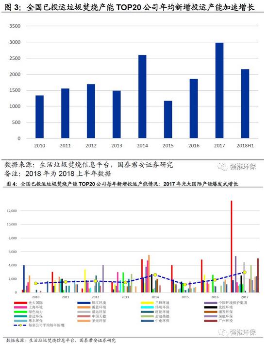 全國(guó)已投運(yùn)垃圾焚燒產(chǎn)能TOP20公司年均新增投運(yùn)產(chǎn)能加速增長(zhǎng):TOP20公司年均新增產(chǎn)能2011年為1339噸/日,到2017年為2981噸/日,僅2018年上半年就達(dá)2155噸/日,產(chǎn)能加速投放趨勢(shì)明顯。