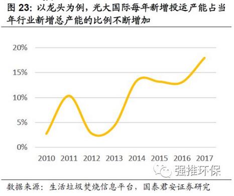 2017年,垃圾焚燒行業(yè)龍頭公司,光大國(guó)際新增垃圾焚燒產(chǎn)能占全行業(yè)當(dāng)年新增焚燒產(chǎn)能的18%,占比自2012年以來持續(xù)提升。