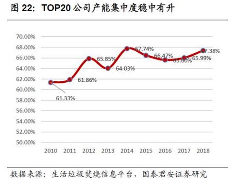 隨著環(huán)保標(biāo)準(zhǔn)和監(jiān)管趨嚴(yán),具有品牌效應(yīng)、運(yùn)營(yíng)經(jīng)驗(yàn)、政府關(guān)系和資金實(shí)力的龍頭公司在拓展業(yè)務(wù)方面更具優(yōu)勢(shì),預(yù)計(jì)行業(yè)集中度有進(jìn)步一步提升趨勢(shì)。2010-2018上半年以來,行業(yè)中投產(chǎn)產(chǎn)能TOP20的公司合計(jì)投產(chǎn)占全行業(yè)總產(chǎn)能的比例由61%上升到67%。