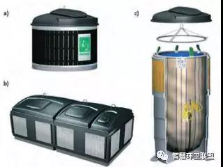 為了進(jìn)行廢物的投放,產(chǎn)業(yè)所有者或物業(yè)管理公司應(yīng)當(dāng)為住宅提供生活垃圾的投放點(diǎn)。投放時(shí)采用的容器分為普通容器(更為常用)和埋入式容器(正在普及)兩種。常用的普通投放容器分別為140升(圖8中c)、240升(圖8中b)、600升(圖8中a)這三種。普通投放容器的缺點(diǎn)是,雖然容積不大,但卻會(huì)占據(jù)將對(duì)較大的空間。埋入式容器部分設(shè)置于地下,內(nèi)部配備高強(qiáng)度織物容納袋,容納能力遠(yuǎn)高于普通容器,能夠在節(jié)省空間的同時(shí),起到降低收運(yùn)頻次的作用。收運(yùn)時(shí),收運(yùn)車輛會(huì)將織物袋從容器中取出,通過打開袋底的機(jī)關(guān)清空廢物。