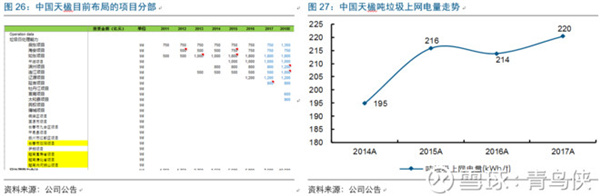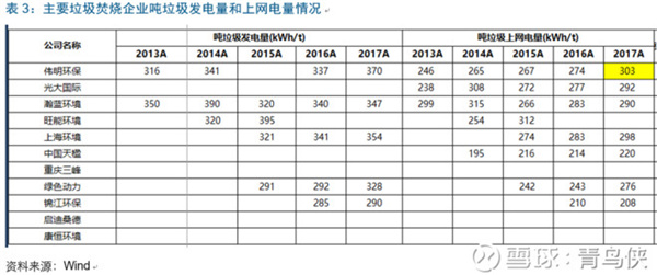 2016年之前,偉明環(huán)保的噸發(fā)和噸上網(wǎng)只能算行業(yè)中上,但2017年其噸上網(wǎng)猛增29kWh至303kwh,排在了行業(yè)第一位;主要是由永強(qiáng)二期(1200t/d,2017年初投運(yùn))帶動,其噸上網(wǎng)高達(dá)335!