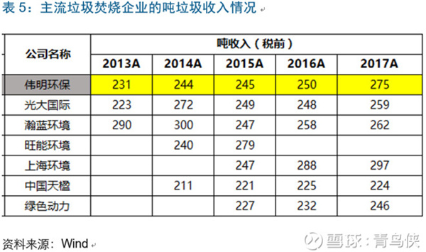 結(jié)論1:從噸收入(稅前)的角度,偉明環(huán)保依靠其最高的噸上網(wǎng)電量,其綜合噸垃圾處置收入約275元(2017年),低于上海環(huán)境(主要是噸垃圾處置費(fèi)太高),高于其他同行!