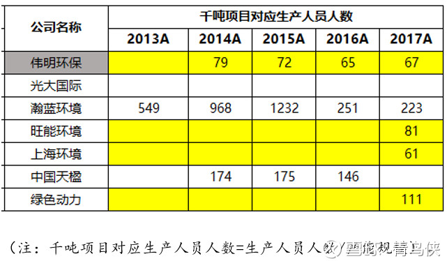 偉明環(huán)保的千噸項(xiàng)目所需生產(chǎn)人員僅僅67人,遠(yuǎn)低于旺能環(huán)境的81人,綠色動力的111人,中國天楹由于一半營收來之設(shè)備銷售,因此即使去除一半人數(shù),千噸項(xiàng)目所需人員也在70-80之間。翰藍(lán)業(yè)務(wù)較多,單獨(dú)看綠電焚燒項(xiàng)目,大約有200號人。(上海環(huán)境偏少因?yàn)橛胁糠峙汕矄T工)