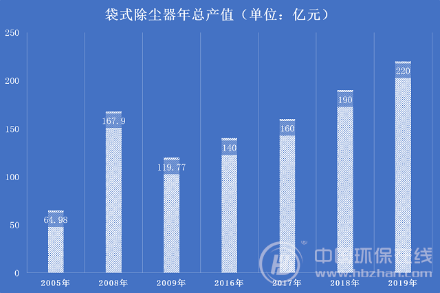 統(tǒng)計(jì)數(shù)據(jù)顯示,我國(guó)袋式除塵行業(yè)總產(chǎn)值在2005年~2008年期間增長(zhǎng)最快,從64.98 億元/年上升至167.90 億元/年,年均增長(zhǎng)率高達(dá)37.23%。2009年受全球金融危機(jī)影響,總產(chǎn)值下滑至119.77億元。過(guò)去幾年,袋式除塵行業(yè)處于去產(chǎn)能的深度調(diào)整期,總產(chǎn)值在150億元/年左右徘徊。