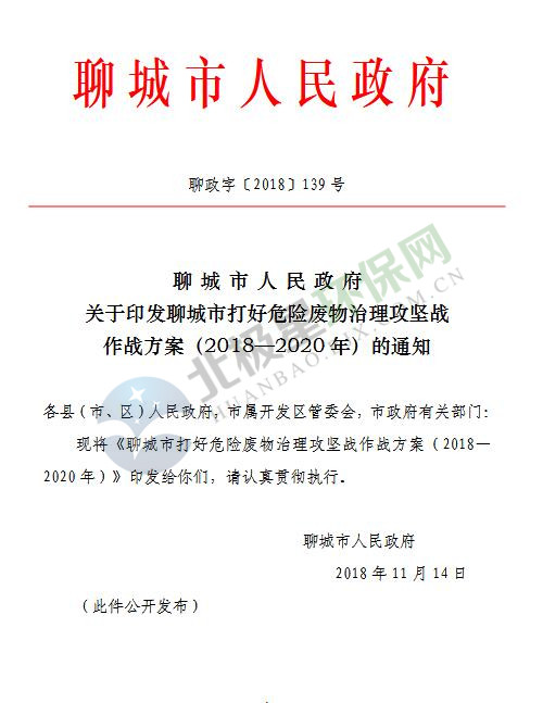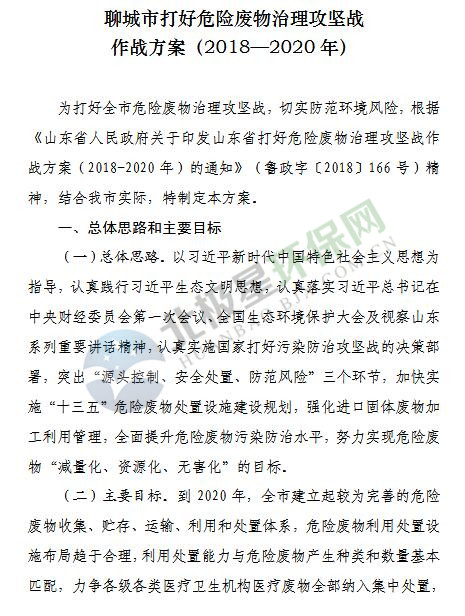 日前,山東省聊城市印發(fā)《聊城市打好危險(xiǎn)廢物治理攻堅(jiān)戰(zhàn)作戰(zhàn)方案(2018—2020年)》,詳情如下: