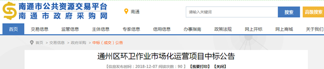2018年12月7日,江蘇省南通市通州區(qū)環(huán)衛(wèi)作業(yè)市場化運營項目發(fā)布中標(biāo)公告,中國天楹股份有限公司(牽頭)和南通中宏環(huán)境發(fā)展有限公司組成的聯(lián)合體成功中標(biāo),中標(biāo)金額為9088.98萬/年,運營期限25年,合同期內(nèi)項目總金額達(dá)22.74億。