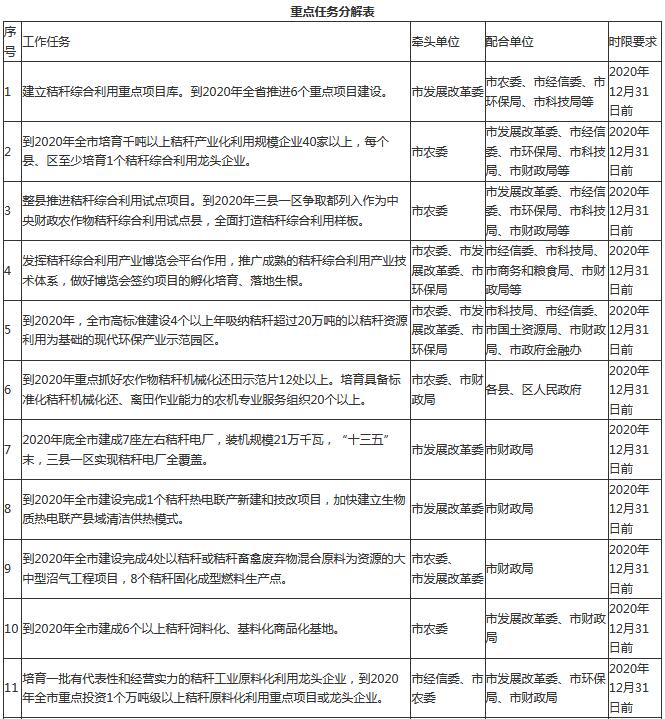 (一)秸稈綜合利用龍頭企業(yè)提升工程。建立秸稈綜合利用重點項目庫,到2020年全市推進(jìn) 6 個重點項目建設(shè)。到2020年全市培育千噸以上秸稈產(chǎn)業(yè)化利用規(guī)模企業(yè)40家以上,每個縣、區(qū)至少培育1個秸稈綜合利用龍頭企業(yè)。整縣區(qū)推進(jìn)秸稈綜合利用試點項目,在秸稈資源量豐富、秸稈產(chǎn)業(yè)化利用基礎(chǔ)較好的地區(qū),鼓勵秸稈產(chǎn)業(yè)與扶貧工作相結(jié)合,優(yōu)先安排中央財政農(nóng)作物秸稈綜合利用試點項目,實行整縣區(qū)推進(jìn),到2020年爭取三縣一區(qū)都列入中央財政農(nóng)作物秸稈綜合利用試點縣。發(fā)揮秸稈綜合利用產(chǎn)業(yè)博覽會平臺作用,推廣成熟的秸稈綜合利用產(chǎn)業(yè)技術(shù)體系,做好博覽會簽約項目的孵化培育、落地生根。(牽頭單位:市農(nóng)委、市發(fā)展改革委、市環(huán)保局;配合單位:市科技局、市經(jīng)信委、市商務(wù)和糧食局、市財政局)