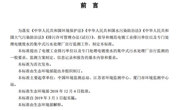 為落實(shí)《中華人民共和國(guó)環(huán)境保護(hù)法》《中華人民共和國(guó)水污染防治法》《中華人民共和國(guó)大氣污染防治法》《排污許可管理辦法(試行)》,指導(dǎo)和規(guī)范電鍍工業(yè)排污單位以及專(zhuān)門(mén)處理電鍍廢水的集中式污水處理廠自行監(jiān)測(cè)工作,制定本標(biāo)準(zhǔn)。本標(biāo)準(zhǔn)提出了電鍍工業(yè)排污單位以及專(zhuān)門(mén)處理電鍍廢水的集中式污水處理廠自行監(jiān)測(cè)的一般要求、監(jiān)測(cè)方案制定、信息記錄和報(bào)告的基本內(nèi)容和要求。本標(biāo)準(zhǔn)為首次發(fā)布。