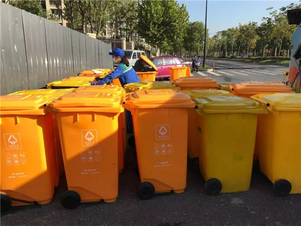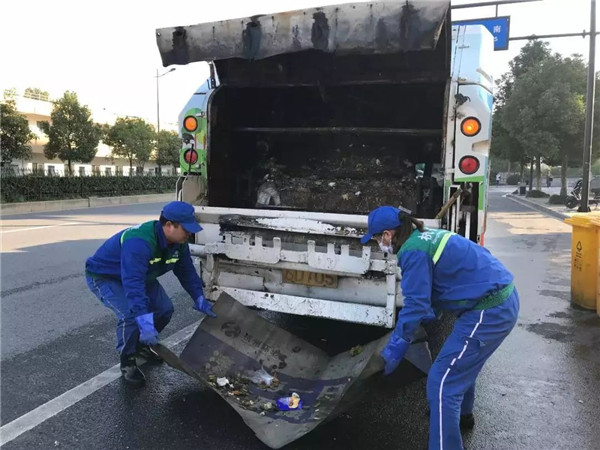 夫妻倆一天要跑60個(gè)點(diǎn),清運(yùn)600多桶垃圾。每到一集運(yùn)點(diǎn),車(chē)輛開(kāi)蓋、地面鋪毯,這樣的流程龔磊夫妻每天要重復(fù)120次,掛桶、傾倒、歸置空桶,一天要重復(fù)180次。夫妻倆配合默契,動(dòng)作干凈利落,垃圾桶內(nèi)滿滿的垃圾瞬間轉(zhuǎn)移到了清潔直運(yùn)車(chē)的“肚子里”。
