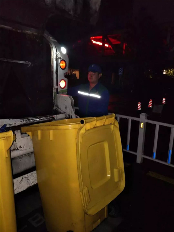 龔磊作業(yè)的線路要收運(yùn)三車(chē)?yán)?,為了減少對(duì)居民的打擾,第一、第二車(chē)線路安排在錢(qián)江新城寫(xiě)字樓作業(yè)。3點(diǎn)半,龔磊、龔縵琴在市民街開(kāi)始第一個(gè)作業(yè)點(diǎn)的垃圾收運(yùn)。
