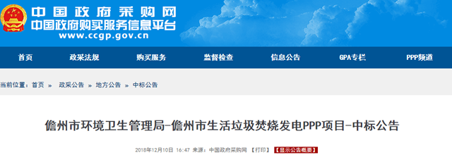 2018年12月10日,海南省儋州市生活垃圾焚燒發(fā)電PPP項目發(fā)布中標公告,中國光大國際有限公司成為中標的社會資本方,垃圾處理服務費76元/噸。