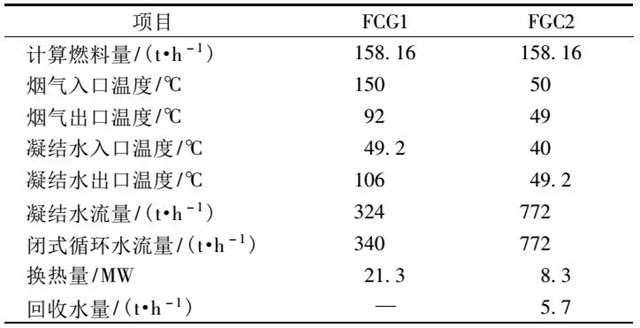 系統(tǒng)設(shè)計(jì)參數(shù)如表2所示。煙氣流經(jīng)第一級(jí)煙氣冷卻器FGC1后,煙溫由150℃降至92℃。脫硫塔出口為50℃的飽和煙氣經(jīng)煙氣冷卻器FGC2后被冷卻至49.2℃。全部的凝結(jié)水以772t/h的流量流入FGC2板式換熱器后,溫度由40℃升至49.2℃,隨后凝結(jié)水分為兩路,凝結(jié)水以324t/h進(jìn)入FGC1的板式換熱器加熱至106℃進(jìn)入6號(hào)低壓加熱器,其余的直接進(jìn)入8號(hào)低壓加熱器。煙氣冷卻器FGC1和FGC2的閉式循環(huán)水流量分別為340,772t/h。系統(tǒng)設(shè)計(jì)的回收水量為5.7t/h。