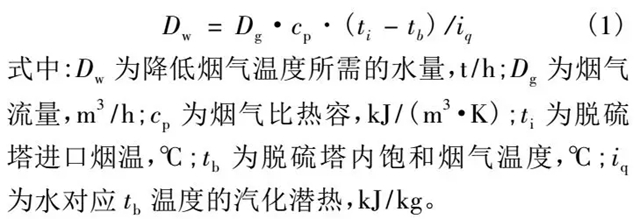 電站鍋爐的設(shè)計(jì)排煙溫度一般在120℃左右,但實(shí)際運(yùn)行時(shí)往往高于這個(gè)數(shù)值。在圖1所示的煙氣流程中,鍋爐的排煙經(jīng)脫硫塔噴淋脫硫、除霧脫水后溫度約為50℃,從脫硫塔排出。脫硫塔內(nèi)消耗的水量可根據(jù)脫硫塔內(nèi)煙氣的能量平衡計(jì)算,見(jiàn)式(1):