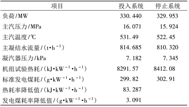 在330MW工況下分別在系統(tǒng)投入和停止的情況下,對(duì)機(jī)組進(jìn)行了性能試驗(yàn),主要數(shù)據(jù)見(jiàn)表4。