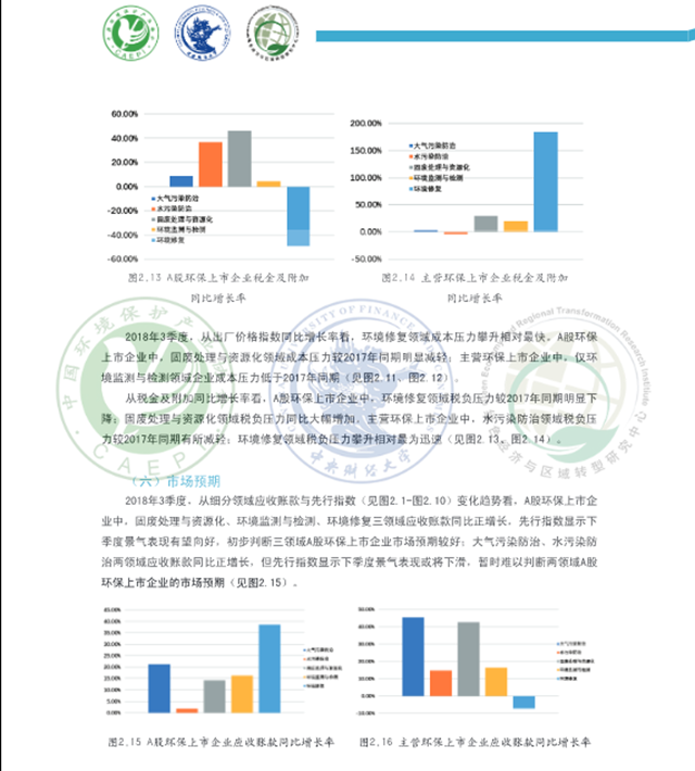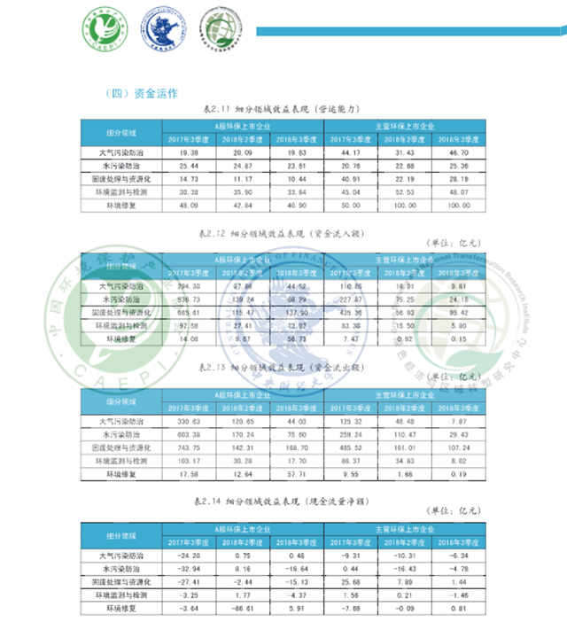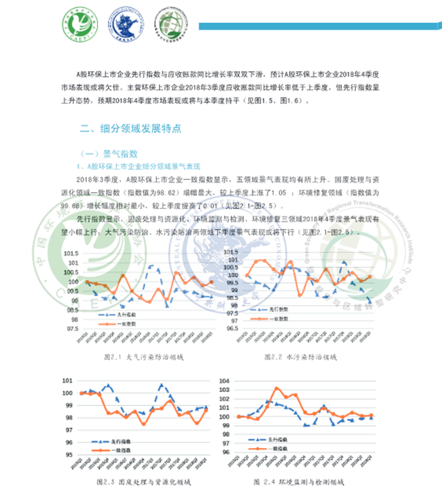 從細分領(lǐng)域看,A股環(huán)保上市企業(yè)2018年3季度各領(lǐng)域景氣表現(xiàn)呈現(xiàn)不同程度的回暖,主營環(huán)保上市企業(yè)在大氣污染防治、水污染防治、環(huán)境監(jiān)測和檢測三領(lǐng)域景氣表現(xiàn)回升。固廢處理與資源化領(lǐng)域規(guī)模較2017年同期有所擴大, A股環(huán)保上市企業(yè)稅負壓力同比大幅增加,成本壓力較去年同期明顯減輕,預(yù)計該領(lǐng)域下季度景氣有望上行:大氣污染防治領(lǐng)域資金外流和國款情況較2017年同期有所改善,預(yù)計該領(lǐng)域A股環(huán)保上市企業(yè)下季度景氣表現(xiàn)下滑,主營環(huán)保上市企業(yè)下季度景氣有望上行:環(huán)境監(jiān)測與檢測領(lǐng)域規(guī)模較上季度呈擴張態(tài)勢, 效益表現(xiàn)總體優(yōu)于上季度,下季度該領(lǐng)域景氣表現(xiàn)有望上行:環(huán)境修復(fù)領(lǐng)域營運能力、現(xiàn)金流量凈額和流動性表現(xiàn)相對較好,A股環(huán)保上市企業(yè)稅負壓力較去年同期大幅下降,主營環(huán)保上市企業(yè)稅負壓力快速攀升,預(yù)計下季度A股環(huán)保上市企業(yè)景氣表現(xiàn)小幅上行,主營環(huán)保上市企業(yè)景氣或?qū)⑾禄核廴痉乐晤I(lǐng)域利潤總額、流動性不及去年同期和上季度,A股環(huán)保上市企業(yè)成本壓力較去年同期有所減輕,主營環(huán)保上市企業(yè)稅負壓力同比小幅減輕,預(yù)計該領(lǐng)域下季度景氣表現(xiàn)下行。