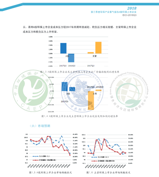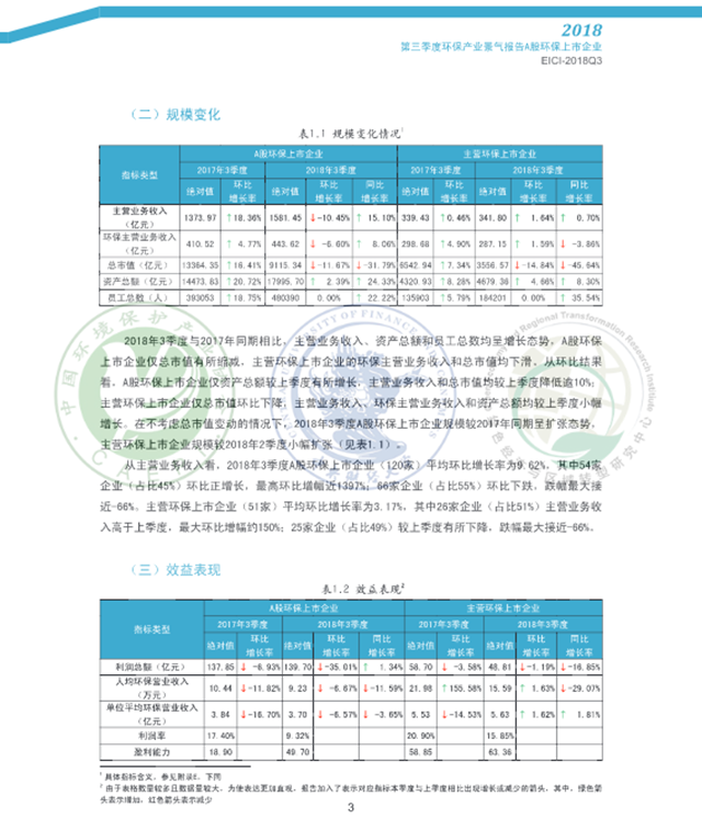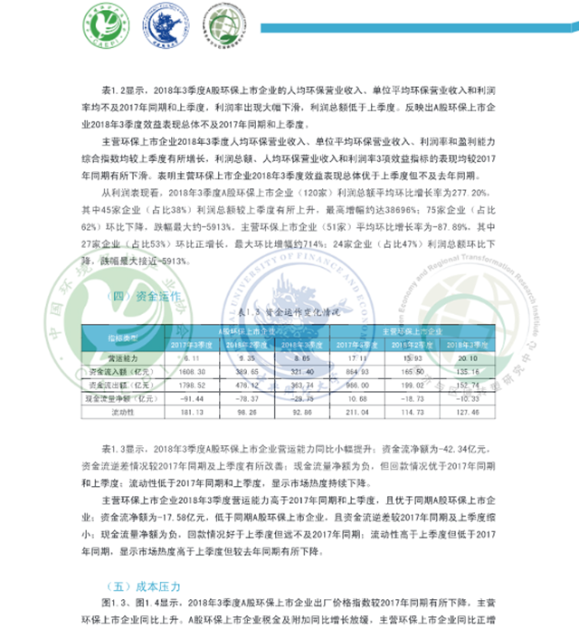 2018年3季度,從主營業(yè)務(wù)收入、環(huán)保主營業(yè)務(wù)收入、資產(chǎn)總額和員工總數(shù)看,A股環(huán)保上市企業(yè)規(guī)模較2017年同期呈現(xiàn)擴張態(tài)勢,主營環(huán)保上市企業(yè)規(guī)模較上季度小幅擴張:效益表現(xiàn)總體不及去年同期:資金流逆差情況較2017年同期和上季度有所改善, 回款情況好于上季度:A股環(huán)保上市企業(yè)成本壓力較2017年同期明顯減輕、稅負壓力增長放緩,主營環(huán)保上市企業(yè)成本壓力和稅負壓力上升較為明顯:預(yù)期A股環(huán)保上市企業(yè)2018年4季度市場表現(xiàn)可能欠佳,主營環(huán)保上市企業(yè)下季度市場表現(xiàn)或?qū)⑴c本季度持平。