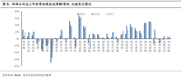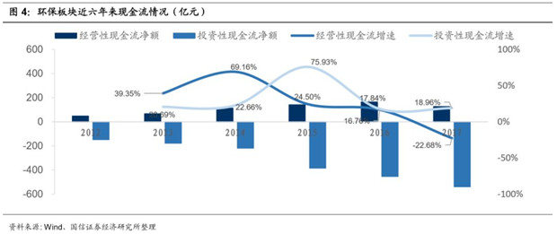 PPP帶動投資性現(xiàn)金流支出的大幅提升使得環(huán)保企業(yè)現(xiàn)金流緊張。從經(jīng)營性現(xiàn)金流來看,雖然近年來環(huán)保企業(yè)營收和利潤大幅增長,經(jīng)營性現(xiàn)金流有所改善,但經(jīng)營性現(xiàn)金流的增長卻趕不上營收和利潤的增速。現(xiàn)金回流成為業(yè)績高速增長的環(huán)保行業(yè)的一大痛點。環(huán)保板塊整體經(jīng)營性現(xiàn)金流凈額的增速從2015年開始顯著下降,而對應的凈利潤增速卻同年顯著上升。到2017年,環(huán)保板塊整體經(jīng)營性現(xiàn)金流凈額出現(xiàn)了-22.7%的負增長。