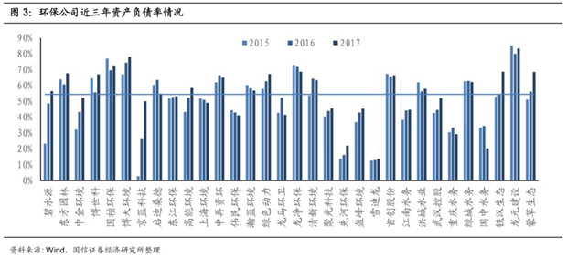 環(huán)保企業(yè)資產(chǎn)負債率逐年攀升。近年來,隨著PPP的大規(guī)模拓展,環(huán)保行業(yè)投資驅(qū)動的模式越發(fā)明顯,企業(yè)不斷融資用于投資新簽的環(huán)保工程項目,企業(yè)資產(chǎn)負債率逐漸提升。環(huán)保板塊主要公司的平均資產(chǎn)負債率從2015年的48%,到2016年的52%,到2017年末增長到54%。