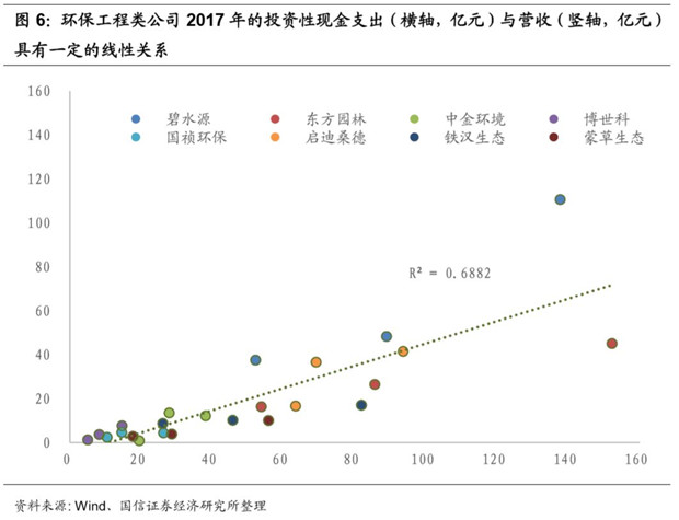 投資驅(qū)動工程,融資能力是投資工程類企業(yè)的核心競爭力。我們通過比較環(huán)保工程類公司的投資性現(xiàn)金支出與營收的關系發(fā)現(xiàn)兩者的線性關系還是比較明確的。在PPP大力發(fā)展工程業(yè)務的模式下,企業(yè)要保障業(yè)績的增速就要不斷的加大投資,所以充裕的現(xiàn)金和強大的融資能力是投資工程類企業(yè)的驅(qū)動力。
