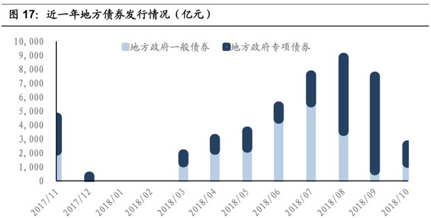地方專項債券發(fā)行額自7月份開始快速上升,最高的9月份達到了6740億元。今年地方債的發(fā)行額度已經(jīng)幾近用盡,臨近12月,地方債發(fā)行急劇下降。