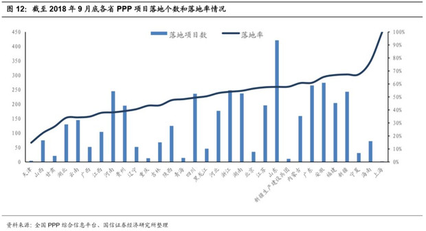 在PPP項目庫清查的過程中,項目總數(shù)依然呈現(xiàn)上升趨勢,落地率穩(wěn)步提升。據(jù)大岳數(shù)據(jù),截止2018年11月24日,項目庫累計入庫12529個項目,總投資額17.30萬億,其中管理庫累計入庫8402個項目,總投資額12.45萬億。全國累計落地PPP項目4454個,投資規(guī)模達6.79萬億,管理庫落地率達到53%,比年初上升14個百分點;從數(shù)量上看,山東落地437個項目排名第一,從規(guī)模上看,貴州落地5402億元排名第一。而示范項目中近九成項目已落地。截至9月底,落地示范項目累計865個、投資額1.9萬億元,落地率87.4%,