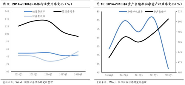 毛利率、凈利率均同比下滑,財務費用上升顯著,資金成本上行是主因。2018H1環(huán)保板塊總體毛利率28.32%,同比下滑0.57pct,凈利率9.00%,同比下滑3.71pct。凈利率下滑幅度顯著超過毛利率,主要原因是前三季度資金面緊張,環(huán)保公司財務成本大幅度增加。前三季度環(huán)保板塊總體的財務費用率為5.33%,同比提高了1.97pct,增幅明顯,而管理費用率和銷售費用率兩項指標均有所下滑,表明環(huán)保企業(yè)前三季承擔著巨大的資金成本上行壓力,同時盡可能地壓縮內(nèi)部成本,降低銷售和管理費用,以期熬過寒冬。