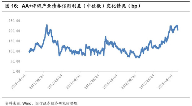 整個市場債券的信用利差已出現(xiàn)下降的趨勢。AA+評級的債券(大部分優(yōu)質(zhì)環(huán)保公司的債券評級,包括碧水源、東方園林等)的信用利差從4月份開始快速攀升,顯示了市場資金對于發(fā)債企業(yè)的償還能力的擔憂。最高信用利差達到了225bp左右,目前已經(jīng)出現(xiàn)了下降的趨勢。