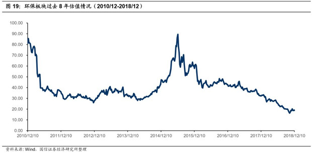從過去8年的估值來看,環(huán)保板塊從2015年6月開始,估值一路下挫,從2015年的86X一路下殺到到2018年12月的19倍,創(chuàng)歷史新低。從估值層面來看,環(huán)保板塊處于估值的歷史低位,下行空間不大,隨著后續(xù)政策、資金等利好兌現(xiàn),板塊估值有待修復。