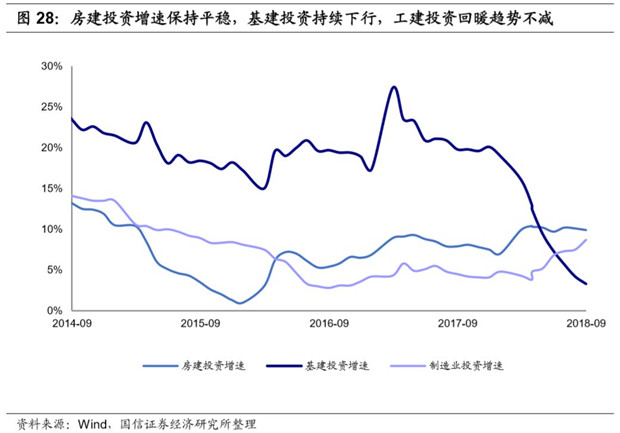 具體來看,基建投資受宏觀降杠桿、PPP清庫以及地方政府債務約束等影響,增速大幅下滑, 2018年1-9月實現(xiàn)3.3%的正增長,比2017年同期下滑16.5pct;房建投資受年初至今房地產(chǎn)景氣帶動,增速相對平穩(wěn),目前仍維持在相對高位的水平,2018年1-9月實現(xiàn)9.9%的正增長;工建投資(制造業(yè))從今年3月份開始觸底回升, 2018年1-9月實現(xiàn)8.7%正增長,增速環(huán)比提升1.2pct,實現(xiàn)連續(xù)六個月回升。