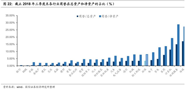 截至三季度末,A股上市公司商譽達到1.45萬億元,同比增長15.18%、環(huán)比增長4.05%,在A股歷史上首度突破1.4萬億元。環(huán)保行業(yè)的商譽共222.61億,占總資產(chǎn)比例為3.48%,占凈資產(chǎn)比例為7.92%。在所有行業(yè)中,環(huán)保商譽總額222.61億,在所有27個行業(yè)中排名第21位(21/27),總金額并不多。從商譽占總資產(chǎn)與凈資產(chǎn)比例來看,環(huán)保行業(yè)商譽占總資產(chǎn)比例為3.48%,商譽占凈資產(chǎn)比例為7.92%,在所有行業(yè)中排名第7位(7/27),僅低于傳媒、休閑服務、計算機、醫(yī)藥、家電、電子,處于較高水平。
