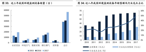 2017年監(jiān)測設備開始出現(xiàn)快速增長,市場集中度提升。原先由于全國范圍內(nèi)傳統(tǒng)監(jiān)測站的建造已經(jīng)基本完成,環(huán)境監(jiān)測設備行業(yè)銷售規(guī)模增速在2016年前放緩至1-2%之間,隨著垂管的推廣,監(jiān)測站點的下沉,2017年行業(yè)銷售數(shù)據(jù)顯著增長。據(jù)中國環(huán)境保護產(chǎn)業(yè)協(xié)會環(huán)境監(jiān)測儀器專業(yè)委員會統(tǒng)計,2017年,我國共計銷售各類環(huán)境監(jiān)測產(chǎn)品56,575 臺(套),同比2016 年增長38.5%。全行業(yè)2017年的總銷售額突破了65 億元,同比增長了1.56%,但市場集中度顯著提升。環(huán)境監(jiān)測行業(yè)內(nèi)的5 家上市公司,聚光科技、先河環(huán)保、雪迪龍、中節(jié)能環(huán)保裝備下屬子公司中節(jié)能天融科技和盈峰環(huán)境下屬子公司宇星科技,2017 年度環(huán)境監(jiān)測設備的銷售額共計達到31.4 億元,同比增長34.8%,市場占有率由2016 年的36.4% 提升至2017年的48.1%。