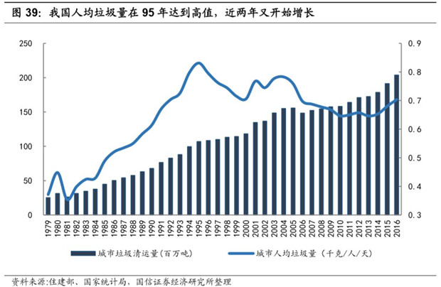 相對于美國,我國城市的垃圾清運量增速較快。從1979年開始,我國城鎮(zhèn)垃圾清運量以每年5.7%的增速快速增長了近40年,且增長態(tài)勢仍未見放緩。而從人均情況從1995年達到頂峰后,開始出現(xiàn)下降。2016 年生活垃圾清運量已經(jīng)達到 2.70 億噸,其中城市生活垃圾清運量 2.03 億噸,縣城生活垃圾清運量 0.67 億噸,近三年清運量增長率約在5%。