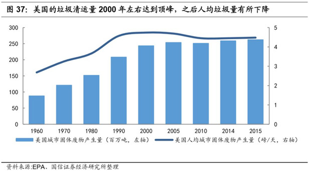 從上世紀60年代開始,美國城市的固體廢物產(chǎn)生量開始以年化1.5%的速度快速增長了40年,總固廢產(chǎn)生量從1960年的8800萬噸增長到2000年的2.5億噸,而人均固廢產(chǎn)生量也從2.68磅/天增加到了4.75磅/天。美國的垃圾清運量2000年左右達到頂峰,之后由于回收比例的提升和人們環(huán)保意識的增長,人均垃圾量有所下降,到2015年美國人均產(chǎn)生4.5磅/天左右的固體廢棄物。