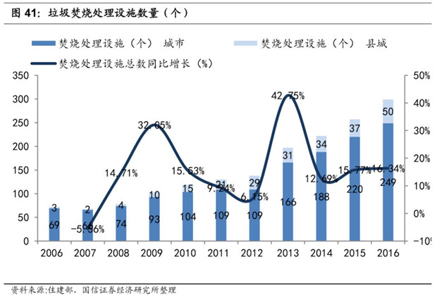 2016 年全國生活垃圾焚燒處理設施數(shù)量達到 299 個,同比增長 16.34%;生活垃圾焚燒處理能力達到 27.82 萬噸/ 日,同比增長 18.28%。2012-2016 年年均復合增速 20%左右。