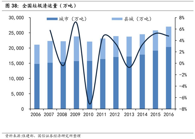 農(nóng)村地區(qū)垃圾處理仍處于初級階段。根據(jù)住建部發(fā)布的《城鄉(xiāng)建設統(tǒng)計年鑒》,農(nóng)村地區(qū)現(xiàn)每年產(chǎn)生垃圾總量穩(wěn)定在 6600 萬噸以上,人均垃圾產(chǎn)生量穩(wěn)定處于 0.3 千克/天的水平。2016年農(nóng)村人口占總?cè)丝诘?3%,農(nóng)村的人均垃圾產(chǎn)生量和垃圾清運比例有巨大的提升空間,所以考慮經(jīng)濟發(fā)展和農(nóng)村垃圾清運比例的提升,我國的垃圾焚燒市場未來空間仍然十分廣闊。