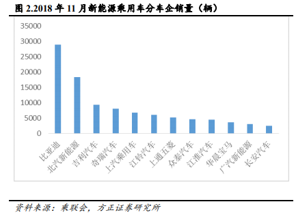 11 月中汽協(xié)數(shù)據(jù)公布,新能源汽車產(chǎn)銷量分別為17.3 萬輛和16.9 萬輛,同比增長分別為 36.9%和 37.6%。新能源乘用車銷量為 14 萬輛,其中純電動乘用車 10.9 萬輛,插電式混合動力乘用車 3.1 萬輛;新能源商用車的銷量為 3 萬輛,純電動商用車銷售 2.9 萬輛。2018 年 1-11 月新能源汽車?yán)塾嬩N量 103 萬輛,同比增長 68%。