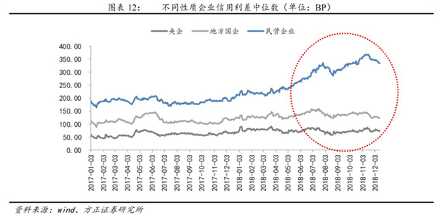 2018年民企融資信用利差持續(xù)擴(kuò)大。根據(jù)不同企業(yè)性質(zhì)的產(chǎn)業(yè)債信用利差統(tǒng)計(jì),2018年4月以來(lái),民企信用利差持續(xù)擴(kuò)大,到11月中旬達(dá)到接近370BP,近期開始回落,目前利差水平約在350個(gè)BP。