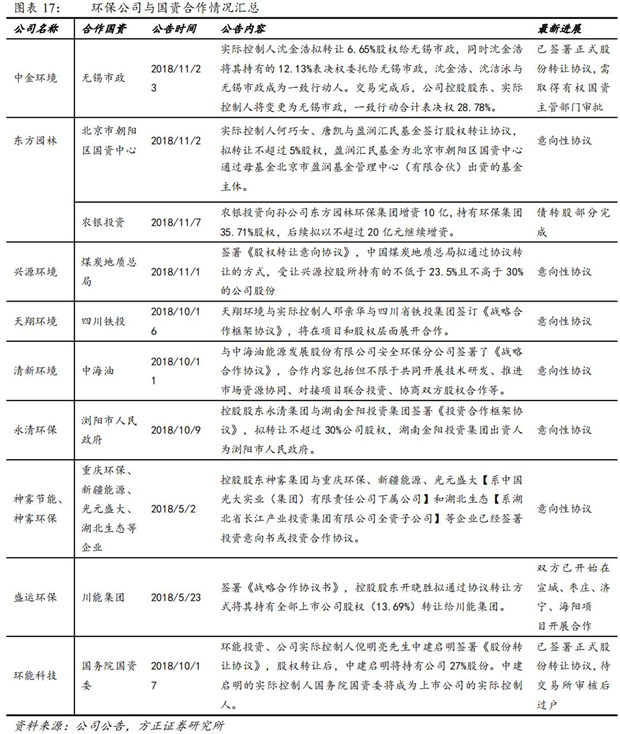 2018年5月至今,環(huán)保板塊已有神霧環(huán)保、盛運(yùn)環(huán)保、東方園林、環(huán)能科技、中金環(huán)境等民營(yíng)企業(yè)公告將通過(guò)引入國(guó)企或政府資金作為戰(zhàn)略投資人或者出讓控股權(quán)保障企業(yè)持續(xù)經(jīng)營(yíng)。