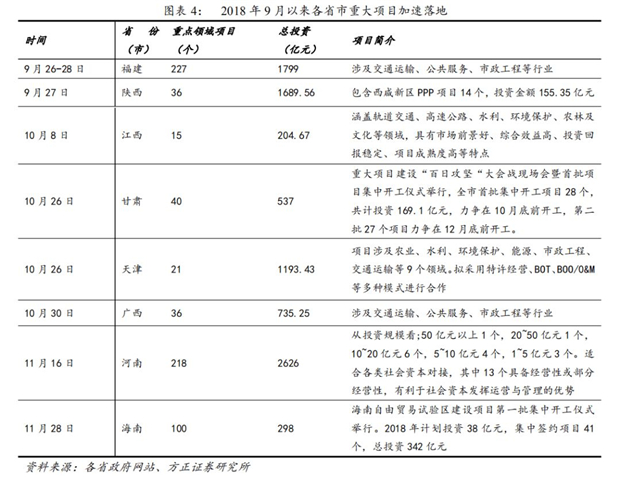 2018年年中以來(lái),基建補(bǔ)短板政策不斷加碼。2018年7月,政治局會(huì)議、國(guó)常會(huì)分別作出要求加強(qiáng)“基建領(lǐng)域補(bǔ)短板”,此后基建補(bǔ)短板政策不斷加碼,各省市重大項(xiàng)目加速落地。