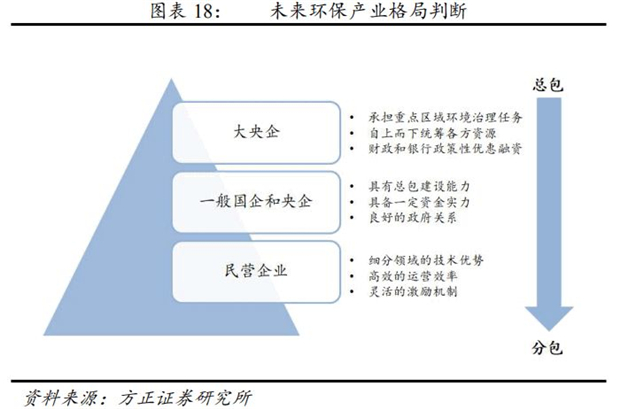 我們認(rèn)為環(huán)保產(chǎn)業(yè)將放棄之前的粗放式發(fā)展,進(jìn)入追求高質(zhì)量發(fā)展的階段。經(jīng)過(guò)2-3年的格局重塑,我們認(rèn)為未來(lái)行業(yè)格局將形成國(guó)企央企主導(dǎo)投資、民企專注細(xì)分市場(chǎng)技術(shù)的新格局。