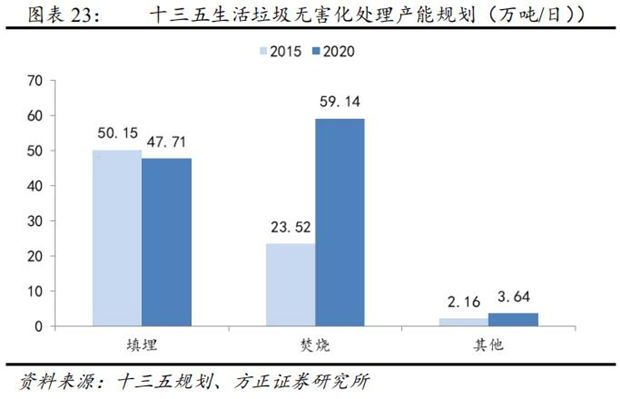 十三五規(guī)劃提出,到2020年全國(guó)垃圾焚燒處理能力要達(dá)到59.14萬(wàn)噸/日,占無(wú)害化處理能力的比例達(dá)到54%,較2016年底27.82萬(wàn)噸/日增加31.32萬(wàn)噸/日。