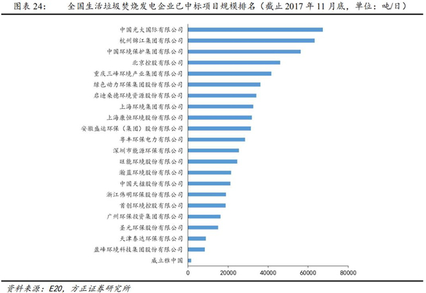 根據(jù)E20研究院統(tǒng)計(jì)排名,截止2017年11月底,已中標(biāo)的垃圾焚燒發(fā)電項(xiàng)目規(guī)模前五企業(yè)項(xiàng)目規(guī)模占比達(dá)到 42.26%,規(guī)模前十企業(yè)項(xiàng)目規(guī)模占比達(dá)到67.86%,行業(yè)市場(chǎng)集中度較高。