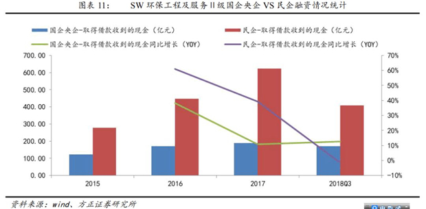 2018年民企融資陷入冰點(diǎn)。我們統(tǒng)計(jì)了SW環(huán)保工程及服務(wù)Ⅱ級(jí)公司的銀行借款情況,2018年前三季度國(guó)企和央企借款取得的現(xiàn)金規(guī)模171億元,同比增長(zhǎng)13%;民營(yíng)企業(yè)借款取得的現(xiàn)金規(guī)模407億元,同比下降2%。可見(jiàn),2018年國(guó)有企業(yè)從銀行借款未受到影響,但民營(yíng)企業(yè)從銀行借款取得的現(xiàn)金規(guī)模明顯縮小。